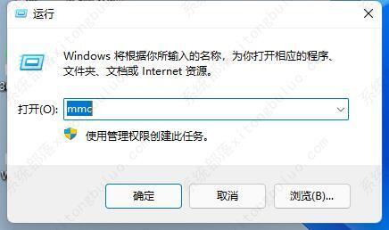 2、在运行窗口中输入命令“mmc”,回车键打开控制台。