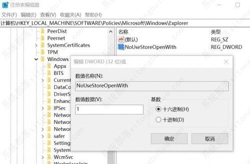3、在该路径下,右击右侧空白处,选择“新建”一个“DWORD(32位)值”,将其命名为“NoUseStoreOpenWith”后,双击打开,在窗口中将数值数据改为“1”,点击确定保存即可。