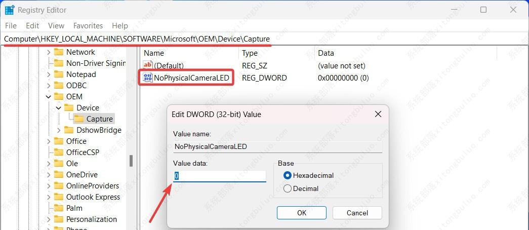 2、进入注册表编辑器,将“ComputerHKEY_LOCAL_MACHINESOFTWAREMicrosoftOEMDeviceCapture”复制到上方地址栏中,回车定位到此。