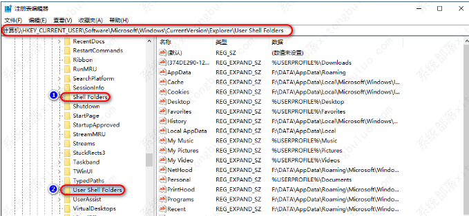 3、将“计算机HKEY_CURRENT_USERSoftwareMicrosoftWindowsCurrentVersionExplorerShell Folders”复制到上方地址栏中。