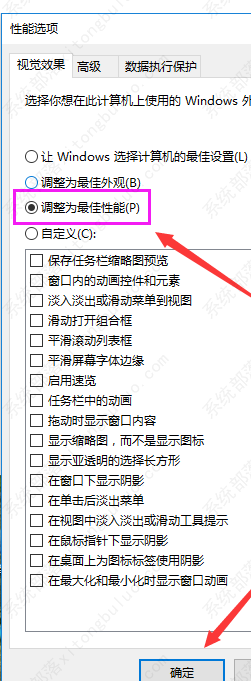 4、选择“选择调整为最佳性能”然后点击“应用”再点击“确定”。