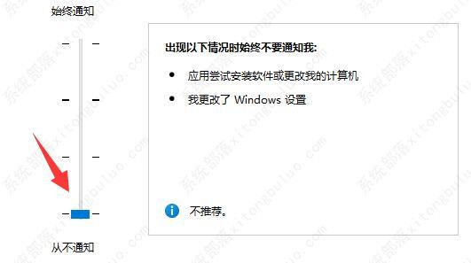 6、最后将左侧滑块移动到最底部“从不通知”即可解决。