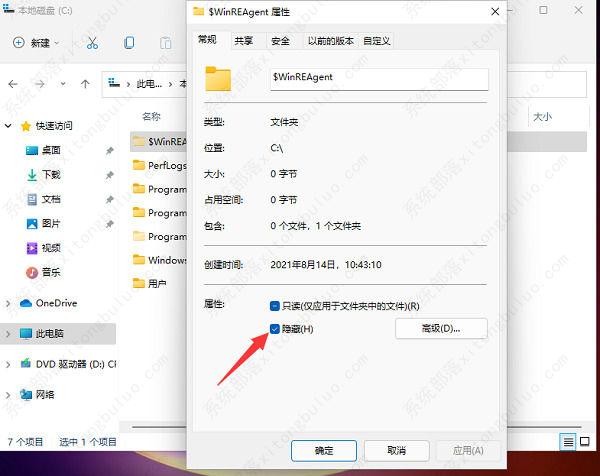 4、如果想要将其取消隐藏的话,选中右击选择“属性”打开,在窗口中,找到“常规”选项卡下方的“隐藏”属性,将其取消勾选,点击应用确定保存即可。