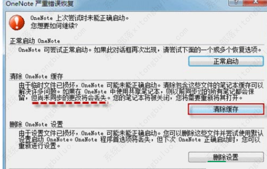 3、在 OneNote 严重错误恢复窗口中,单击“清除缓存”按钮。正如此处说明所述,清除缓存后,此前所有未保存/同步的文件都将会丢失。(养成随时保存的习惯是多么的重要啊,感慨一下~)。