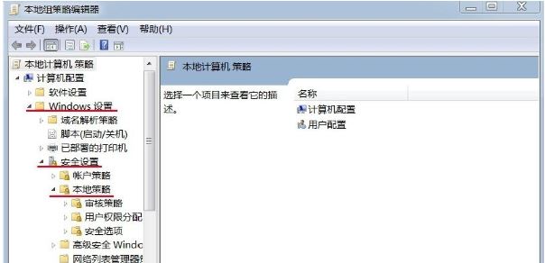 2、在本地组策略编辑器窗口,展开Windows设置 - 安全设置 - 本地策略。