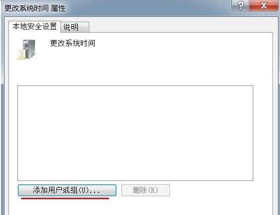 4、在打开的更改系统时间属性窗口,我们点击:添加用户或组(U)。