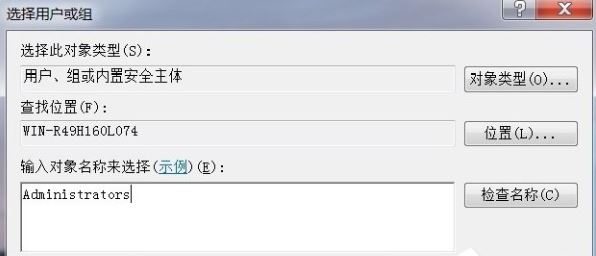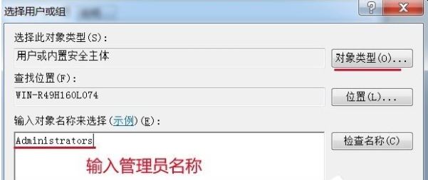 5、在选择用户或组窗口的输入对象名称来选择(U)栏中输入管理员名称:Administrators,再点击:对象类型(O)。