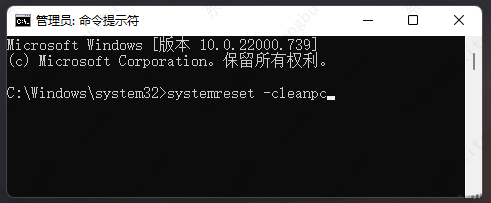 1、命令提示符中,输入并按回车执行【systemreset -cleanpc】命令,可以唤起系统重置。