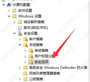3、进入新界面后,依次点击“计算机配置——Windows设置——安全设置——本地策略——安全选项”。