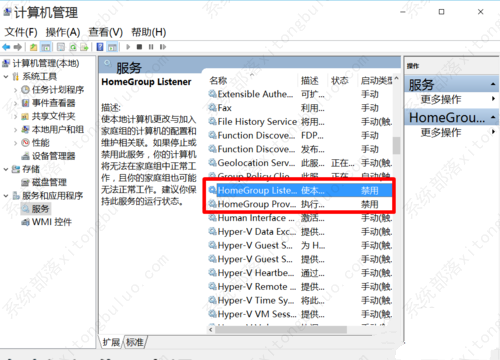 在左侧的菜单选择“服务”,并在右侧找到“HomeGroup Listener”和“HomeGroup Provider”两个服务。