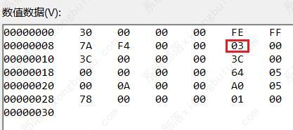 5、然后找到“00000008”一行,“FE”一列下的数值,将它改为“00”即可。