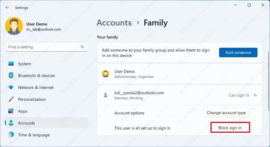 4、在“您的家人”部分下,选择帐户并单击“阻止登录”按钮。