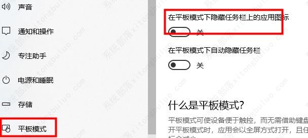 2、点击平板电脑模式——在右侧处于平板电脑模式时隐藏任务栏上的应用图标设置为关闭,即可。