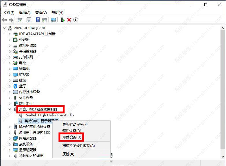 2、在【声音、视频和游戏控制器】选项下,鼠标右键选中需要卸载的音频设备,并选择【卸载设备】选项。