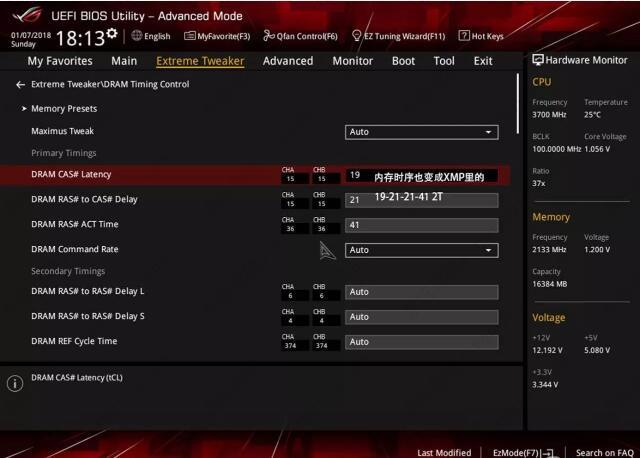 随后进入下方的DRAM Timing Control选项里,可以看到此时的内存主要参数变成的XMP里的19-21-21-41。