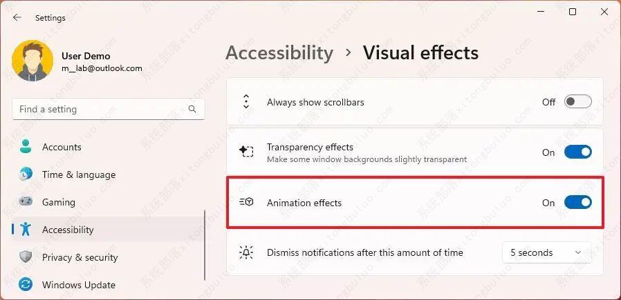 要在 Windows 11 上打开动画效果,请使用以下步骤: