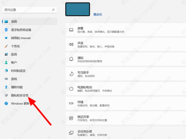 1、在键盘上按下快捷键【win+i】打开设置,在设置页面,点击【隐私和安全性】。