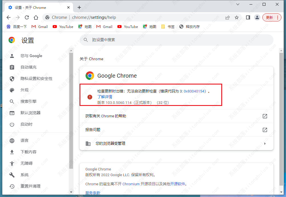 3、当谷歌浏览器不能自动更新时,将会出现下图中的情况。