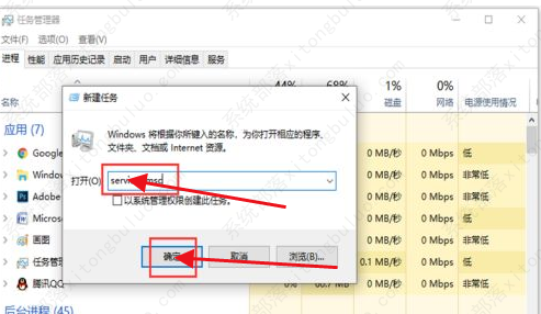 6、接着在窗口中输入“services.msc”,点击确定打开。