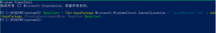 2、复制:【$manifest = (Get-AppxPackage Microsoft.WindowsStore).InstallLocation + ‘\AppxManifest.xml’ ; Add-AppxPackage -DisableDevelopmentMode -Register $manifest】 命令,并在【Windows Powershell 管理员命令符窗口】中,右键点击空白处,将命令粘贴到窗口中,按下键盘上的回车键。