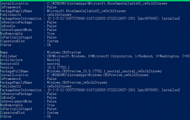 3、再复制:【Get-AppXPackage -AllUsers |Where-Object {$_.InstallLocation -like “*SystemApps*”} 】并粘贴到窗口中,按下回车键,等命令执行完成以后,退出 Windows Powershell 管理员命令符窗口。