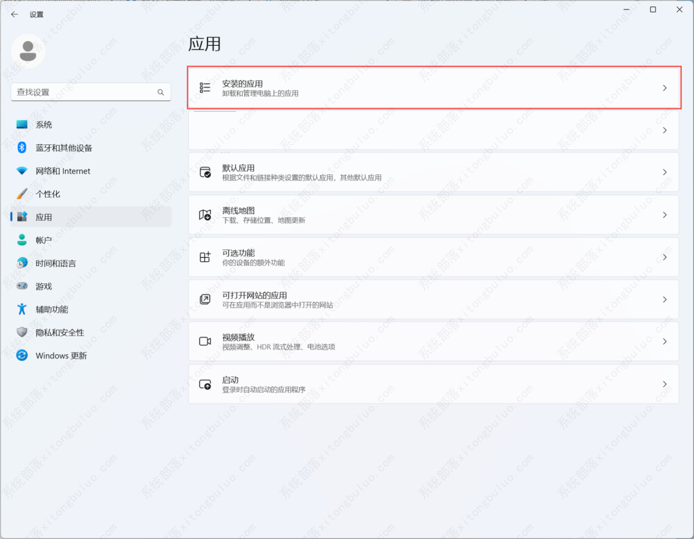 2、然后点击左侧面板的“应用”标签,在该标签页选择“安装的应用”。