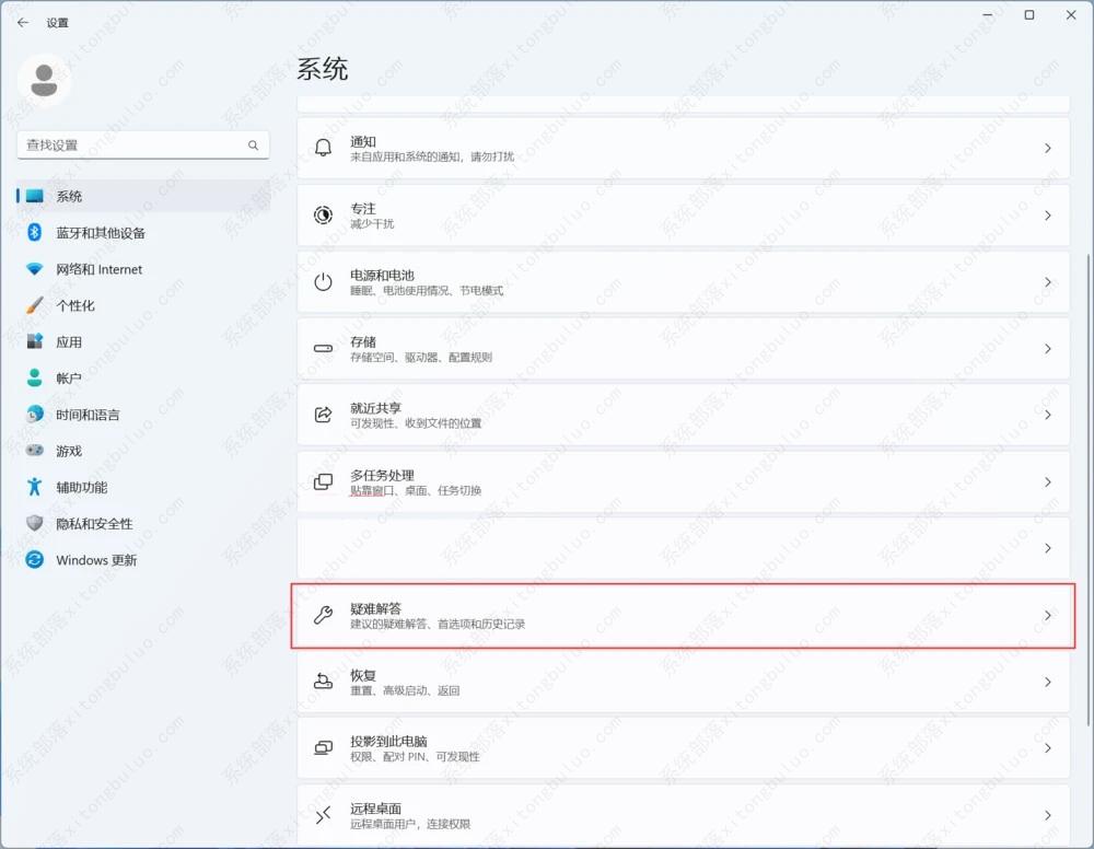 2、点击左侧的“系统”标签,选择“疑难解答”。