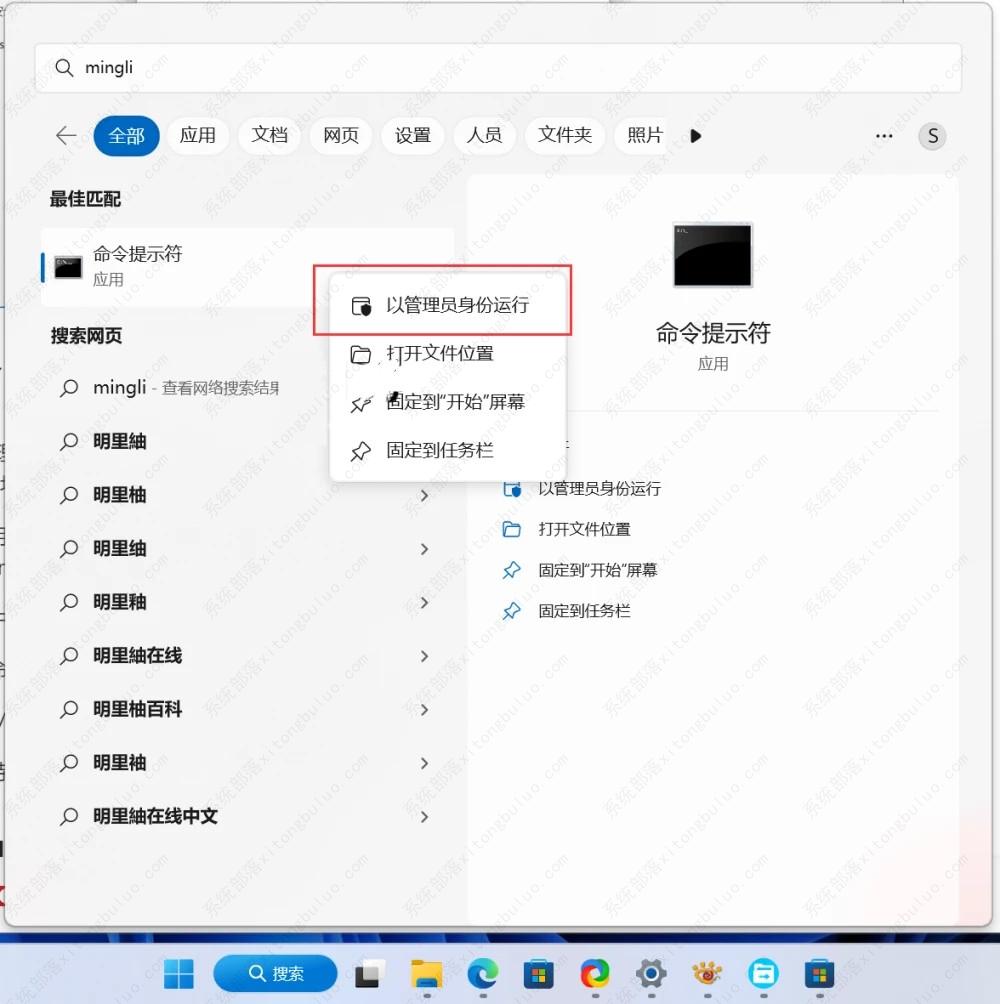 1、在任务栏搜索框中输入“命令提示符”,Win11 系统支持模糊查询,例如“mingli”就会跳出命令提示符。