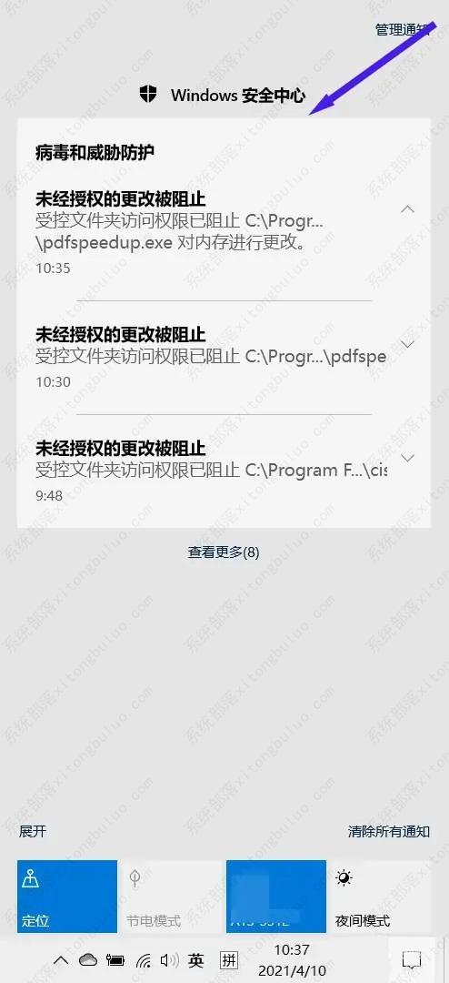 当电脑出现安全问题时,Windows 10系统就会出现这样的安全威胁提示。这个可以直接点击进入。