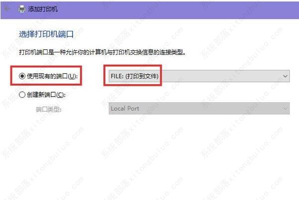 6、然后选择"使用现有的端口",点击右侧的下拉按钮,选择"FILE: (打印到文件)",点击下一步。