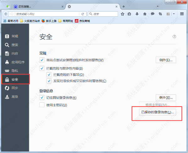 2、接着在打开的新界面中点击左侧的“安全”选项,找到右侧中的“已保存的登录信息”按钮。