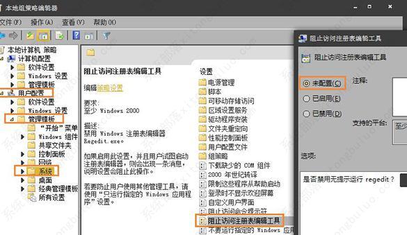 第二:打来用户配置-管理模块-系统-阻止访问注册表编辑工具,然后双击打开,点击未配置,确定。