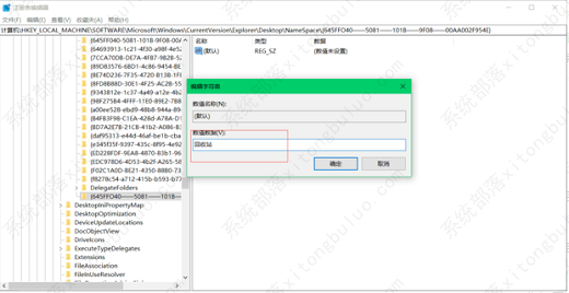 5、在打开的窗口中将“数值数据”改为“回收站”,点击确定保存。