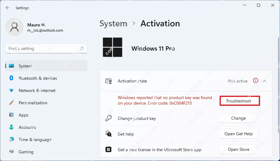 5、单击“Windows 报告在您的设备上找不到产品密钥”旁边的疑难解答按钮。错误代码:0xC004F213。”