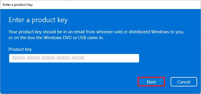 6、输入已安装的 Windows 11 版本的当前 25 位产品密钥。(您也可以使用 Windows 10 密钥。)