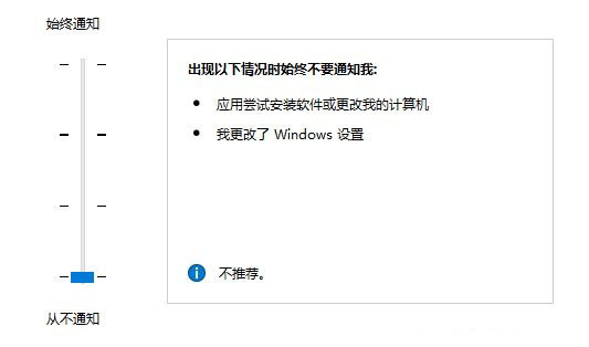 4、在弹出的用户账户控制设置,将滑块移动到最底部,点击确定保存设置即可!