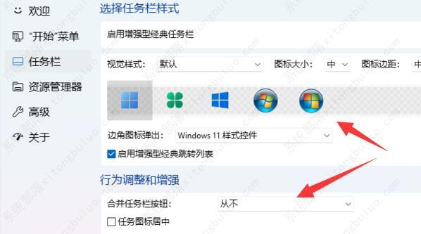 5、你也可以手动调节任务栏的视觉效果,例如图标大小、边距以及合并任务栏按钮。