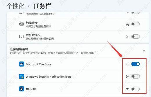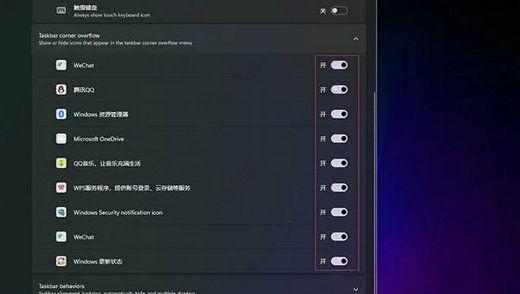 3、点击任务栏角溢出后,将将要显示的应用图标开关打开。