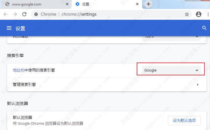 2、接着在设置页面找到搜索引擎一栏,可以看到当前使用的搜索引擎是“Google”。
