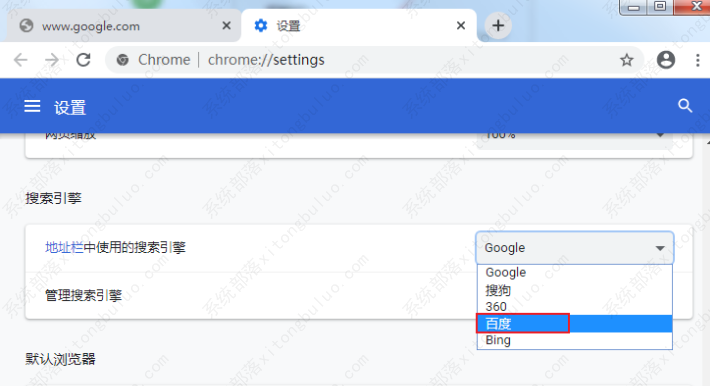 3、这时我们点击选项框的下拉按钮,将搜索引擎改为百度就可以了。