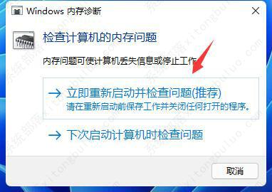 3、确定后悔自动打开Windows内存诊断,在其中选择“立即重新启动并检查问题(推荐)”。