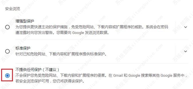 3、然后我们在“安全浏览”中选择“不提供任何保护(不建议)”。