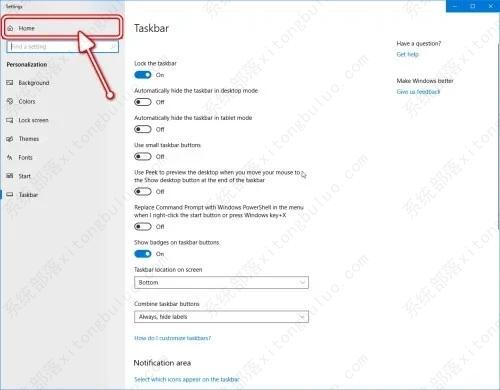 3、进入任务栏设置,点击[主页]按钮,进入设置。