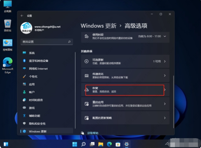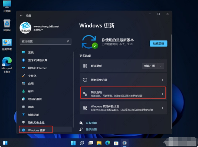 3、在设置界面的左侧选择Windows更新,然后右侧点击高级选项。