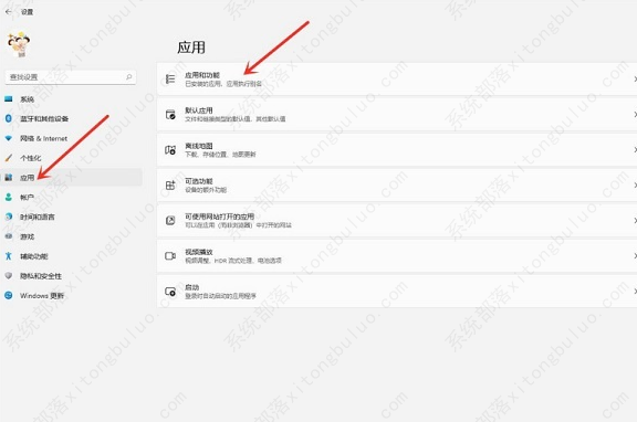 2、进入win11的设置界面,我们点击左边的“应用”,点击右边的“应用和功能”选项。