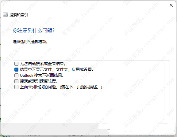 5、运行搜索和索引修复功能,系统会弹出一个窗口,自动检查问题所在。之后,该窗口会显示你可能遇到的系统搜索相关问题,例如:无法启动搜索或查看结果等,按照实际情况选择即可。点击【下一页】,就可以确认以管理员身份对搜索相关问题进行修复,按照提示修复即可。
