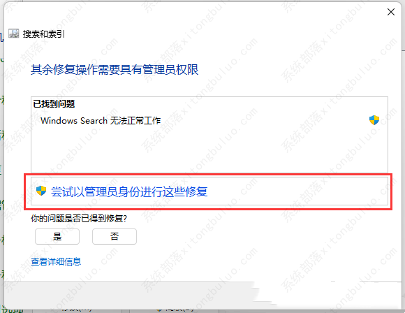 7、其余修复操作需要具有管理员权限。已找到问题,Windows Search 无法正常工作,点击【尝试以管理员身份进行这些修复】。