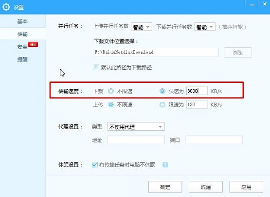 4、在传输右侧传输速度,后面将【下载】选择“限速为”,然后填写3000 左右,点击应用-- 确定 保存设置。