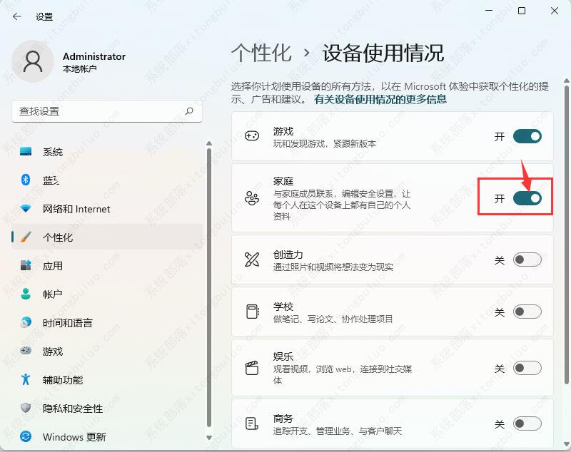 5、找到【家庭】的【关】。