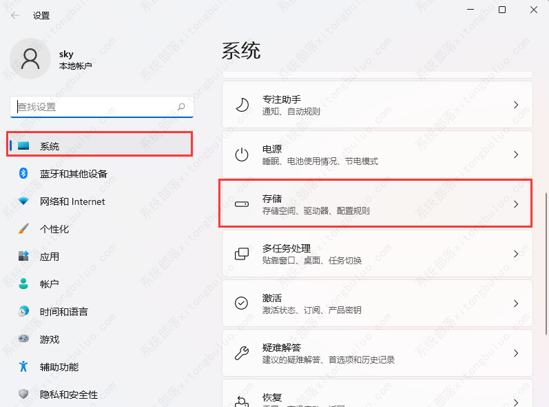 2、Windows 设置窗口,左侧边栏,点击【系统】,右侧点击【存储(存储空间、驱动器、配置规则)】。